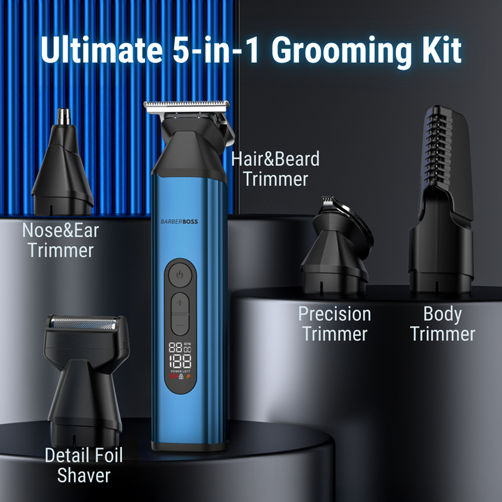 - All-in-One Grooming Kit for Men: This versatile Men’s grooming kit features 5 interchangeable heads -precision trimmer for beard lines & detailing, foil shaver for smooth finishes, body groomer for chest/arms/legs, nose & ear trimmer for nose and ear hair, plus a standard hair & beard trimmer for everyday styling.