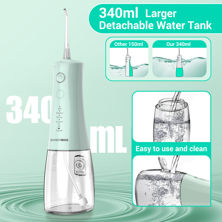 - Generous 340ML Detachable Water Tank for Uninterrupted Flossing: Enjoy longer cleaning sessions without constant refills. The 340ML water tank is detachable, easy to refill, and features a wide opening for effortless cleaning, perfect for maintaining hygiene and ensuring continuous water flow.