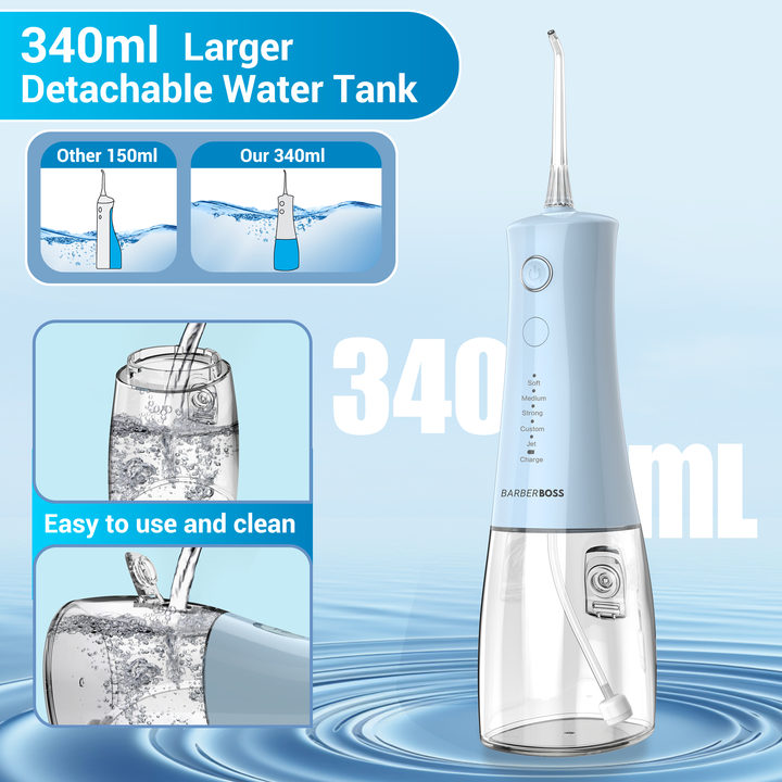 - Generous 340ML Detachable Water Tank for Uninterrupted Flossing: Enjoy longer cleaning sessions without constant refills. The 340ML water tank is detachable, easy to refill, and features a wide opening for effortless cleaning—perfect for maintaining hygiene and ensuring continuous water flow.