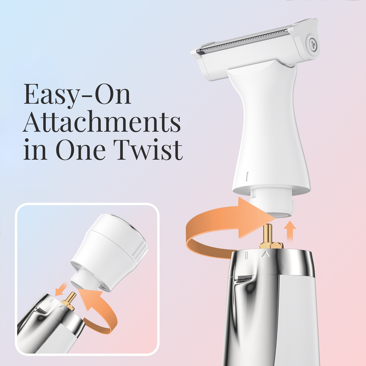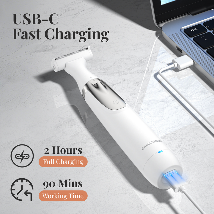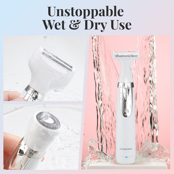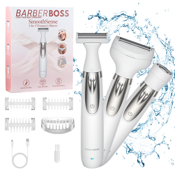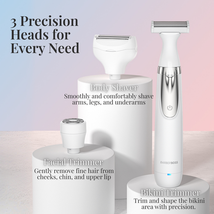 - 3-in-1 Women’s Shaver Kit: The BarberBoss women’s Shaver kit is a complete grooming solution with 3 interchangeable heads: a body shaver for smooth legs and arms, a bikini trimmer for precise styling in delicate areas, and a facial trimmer to gently remove hair from the upper lip, chin, and sideburns.